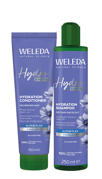 Arricchita con lino alpino, la Linea Hydro Shine deterge delicatamente e dona luminosità ai capelli.